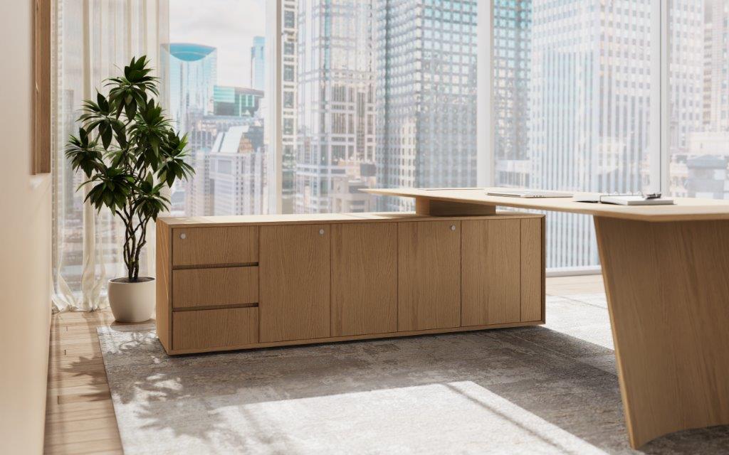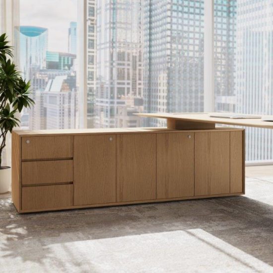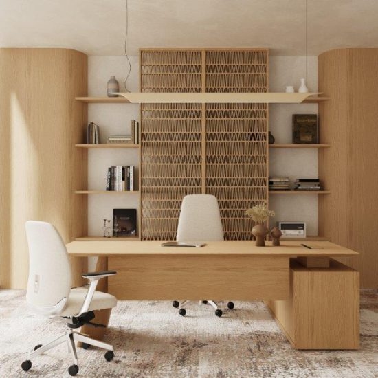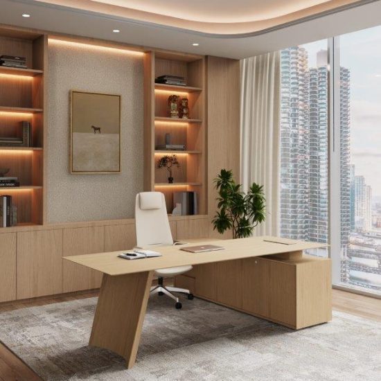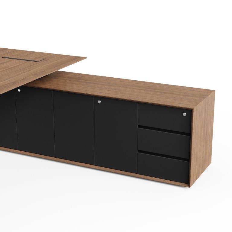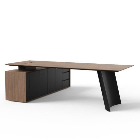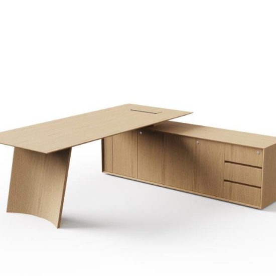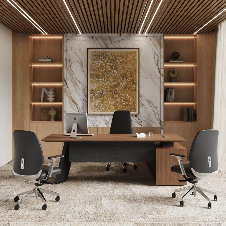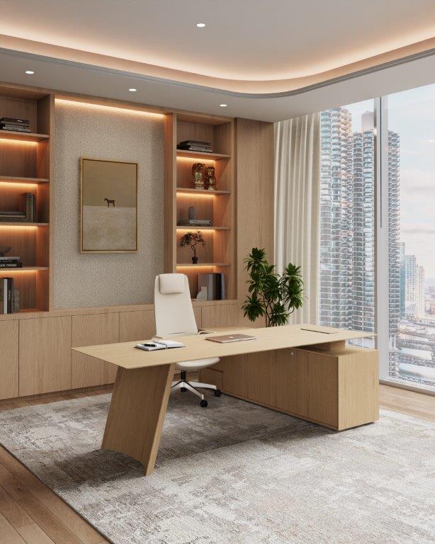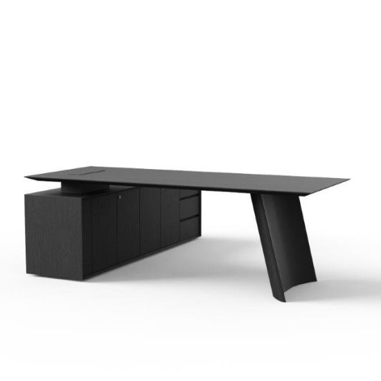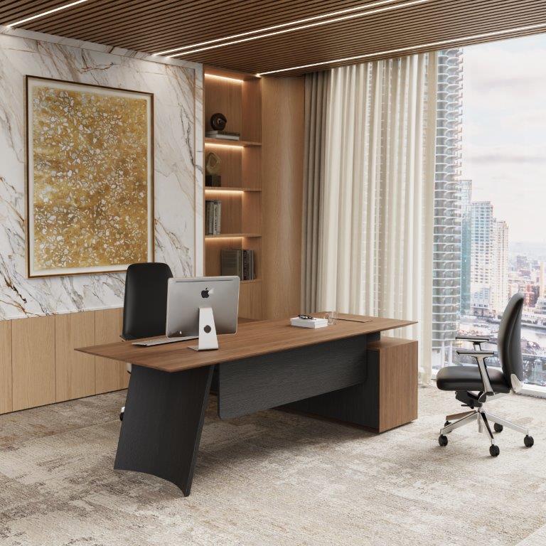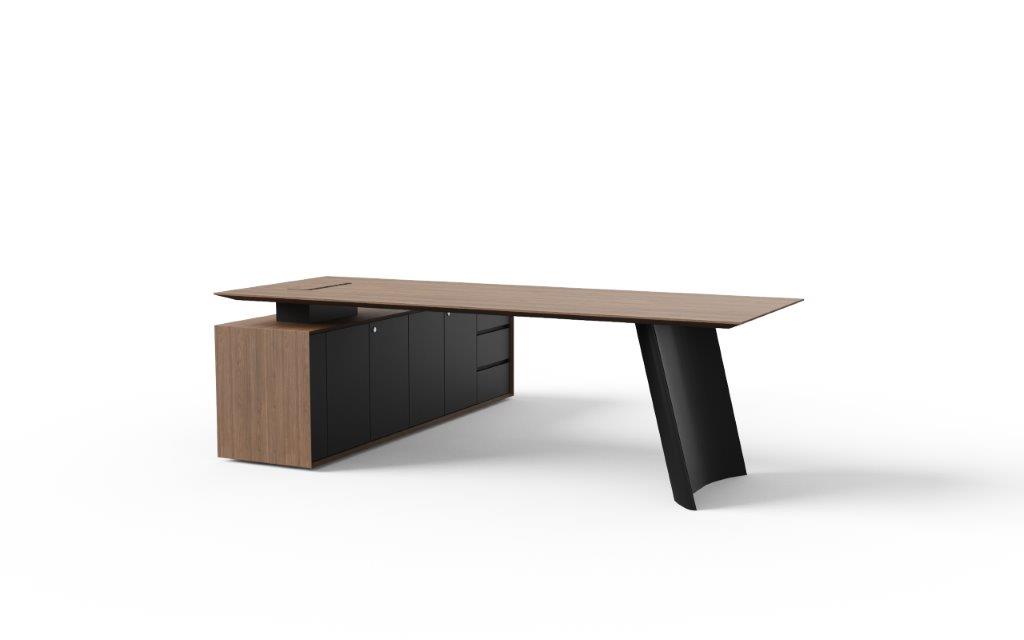 שולחן מנהל יוקרתי בעיצוב מודרני, המתאפיין בקווים נקיים וחיבור מדויק בין החלקים ליצירת מראה רציף ואסתטי. השלוחה המרווחת מספקת פתרון אחסון אלגנטי, בעוד שרגל המתכת הפיסולית יוצרת נוכחות אדריכלית מודגשת — שילוב של יציבות מרשימה ומראה קליל ומרחף. זמין במגוון חומרי גמר, ומתאים לחללי הנהלה המבקשים נראות פרימיום ללא פשרות