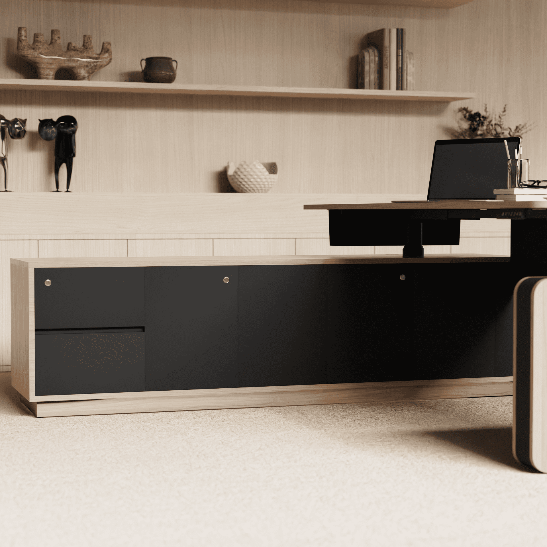 שולחן מנהל חשמלי מתכוונן הינו שולחן מהודר נתמך בצד אחד ע"י שלוחת ארון ומהצד השני עם סגירת דופן בשילוב של מספר חומרי גמר. מערכת שקטה, מהירה ואמינה בעלת אישור מכון התקנים הישראלי. שולחן מנהל מתכוונן חשמלי מאפשר לעבור ממצב ישיבה למצב עמידה ובכך להאיץ את זרימת הדם ולשמור על הרעננות במהלך היום. עבודה מול שולחן מתכוונן חשמלי מעניקה סביבת עבודה ארגונומית המשפרת את הפרודוקטיביות והנוחות.